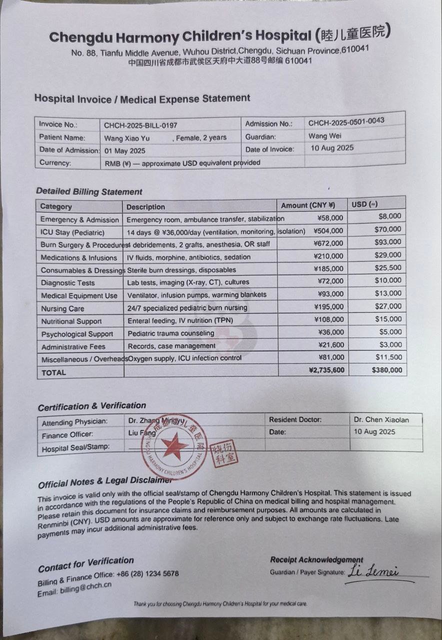• Specialized medical treatments and surgeries for Xiaoyu's severe burns