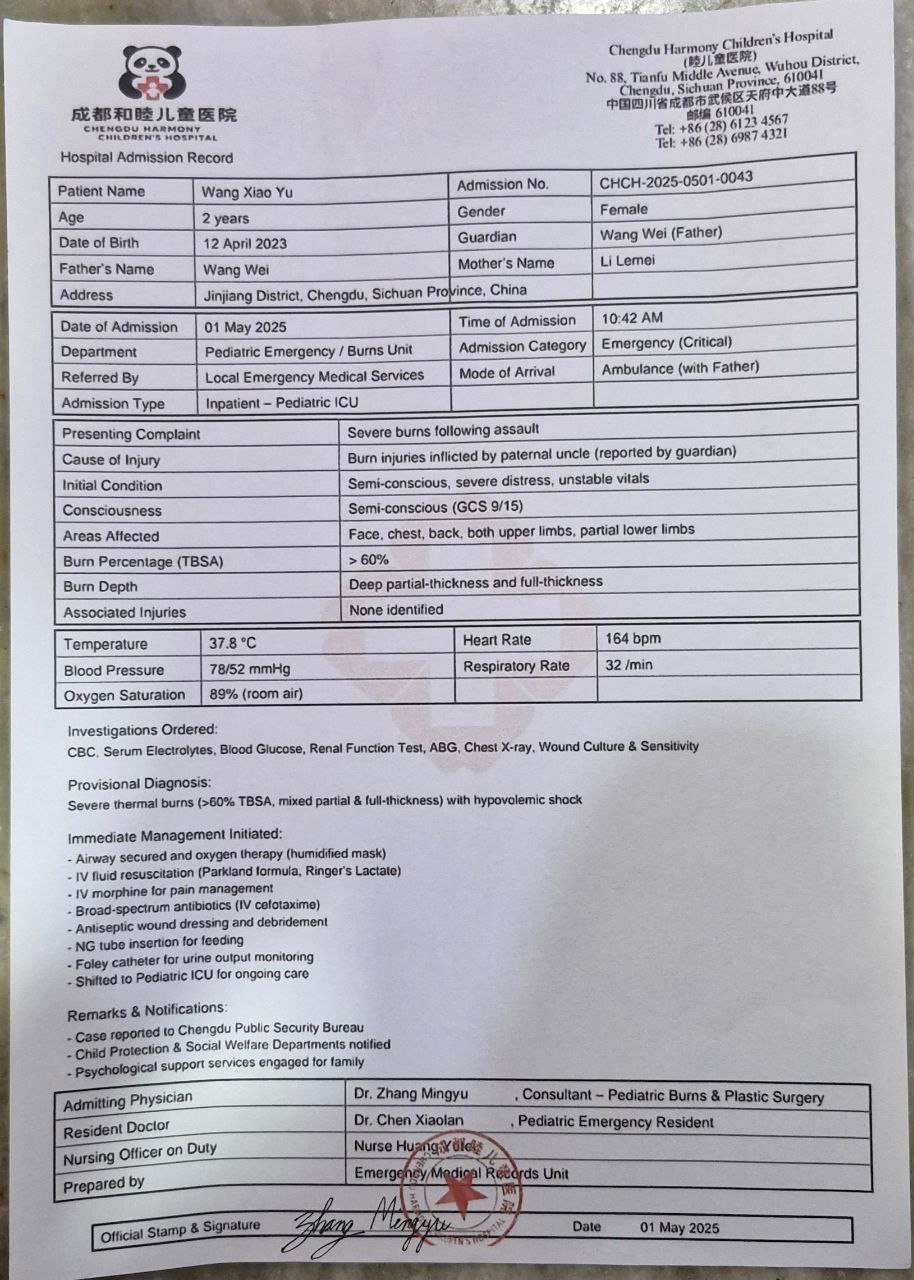 My name is Li Mei, and I am the mother of Xiaoyu, my precious two-year-old daughter. On May 1st, 2025, someone we trusted, her own uncle, did something unimaginably cruel. He deliberately set Xiaoyu on fire, leaving her with severe burns over most of her tiny body.